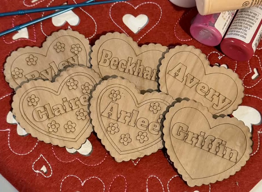 Grab a custom Valentine’s heart to decorate at our Valentine’s party January 24th!