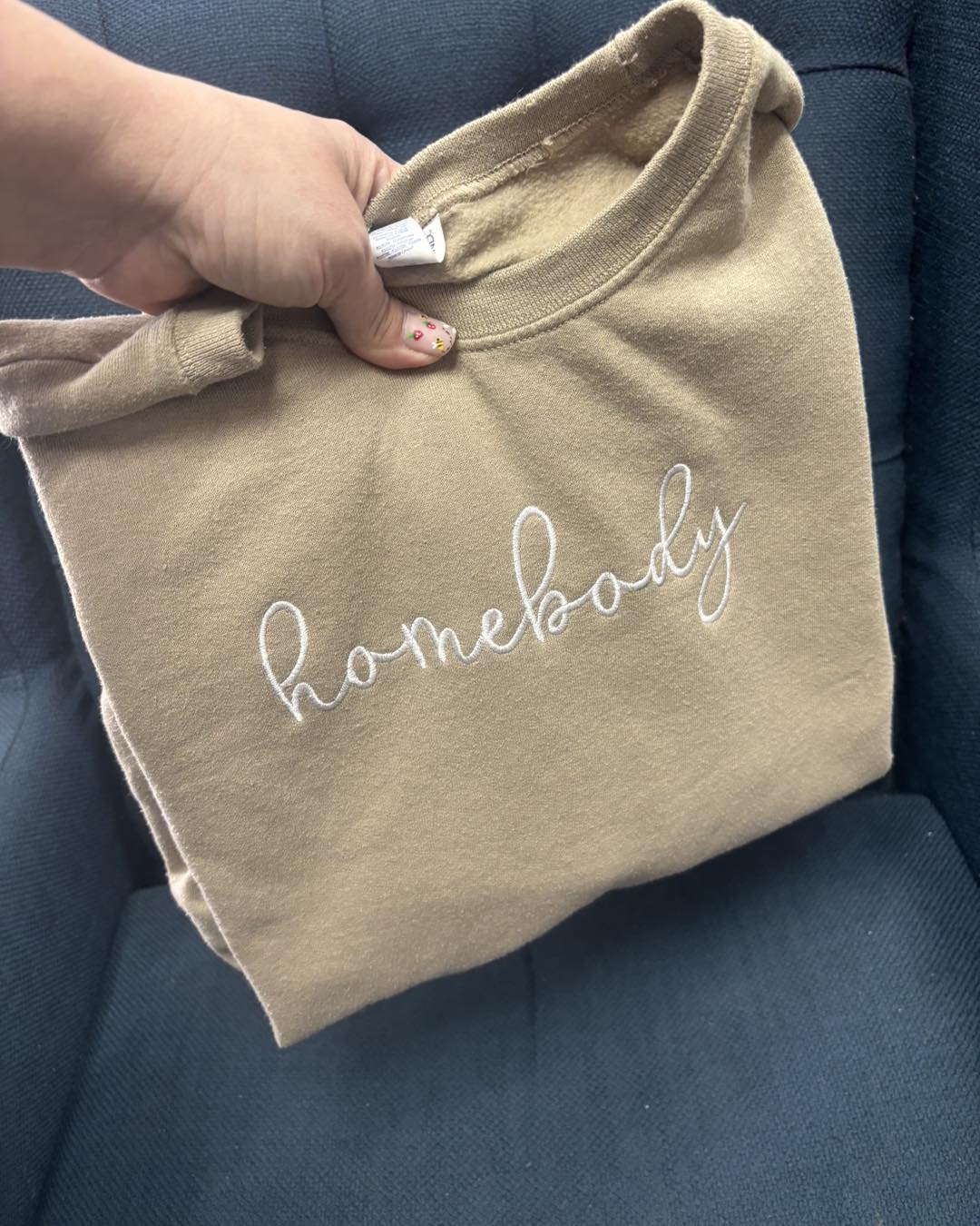 Homebody embroidered across the front to show your favorite activity – being at home!