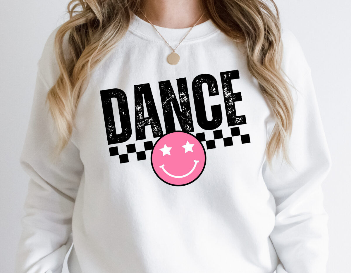 Pick between a tee, crew or hoodie of this dance design with a smiley and checkered detail.